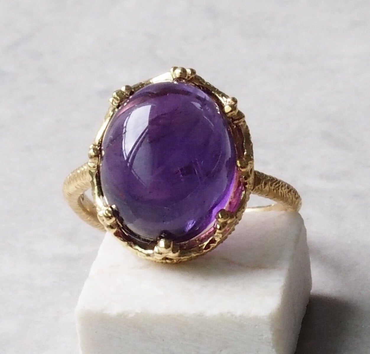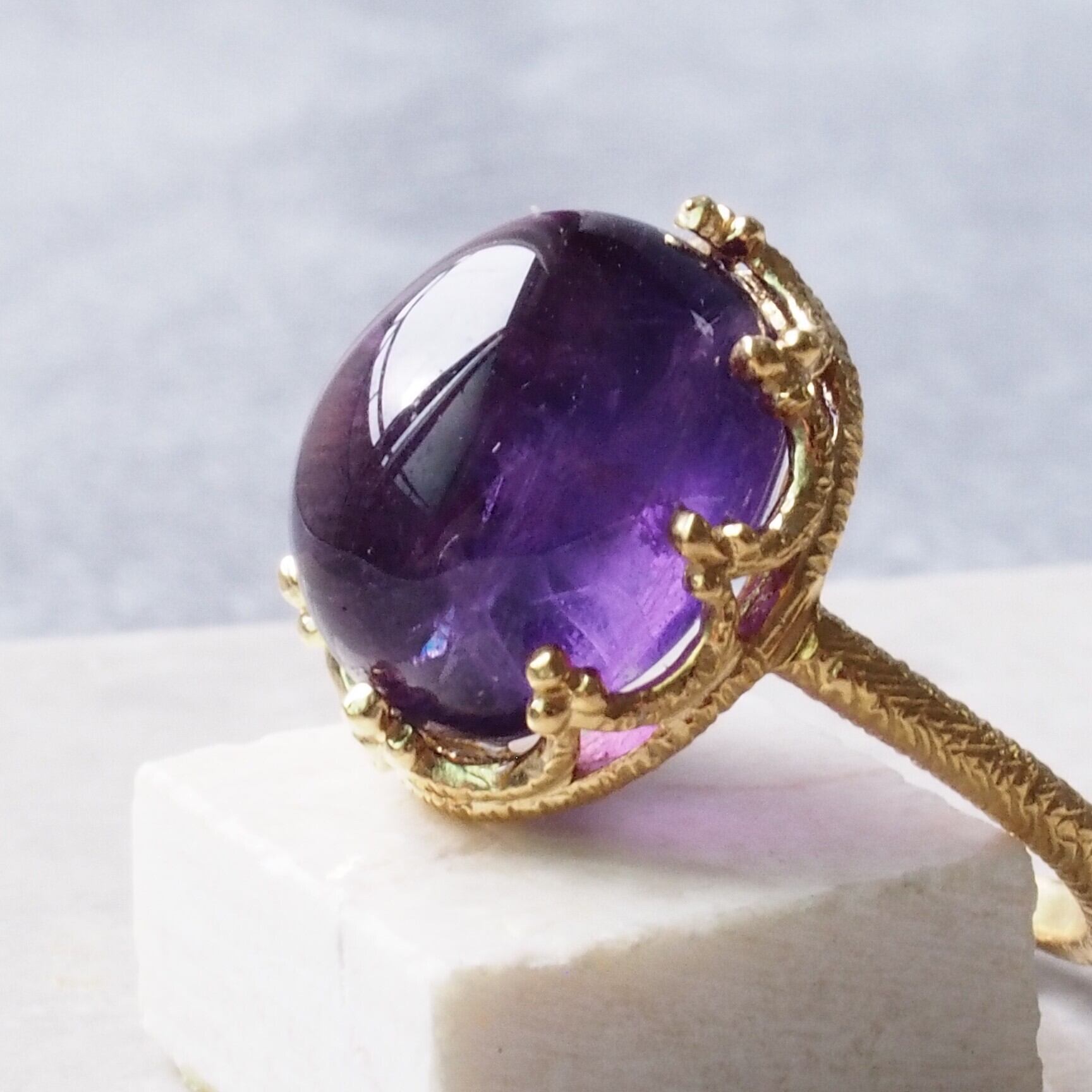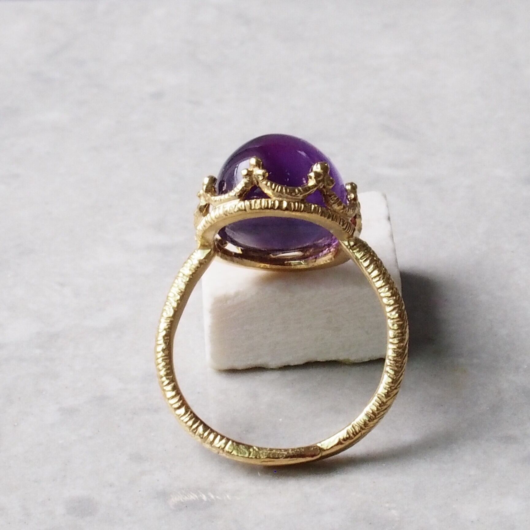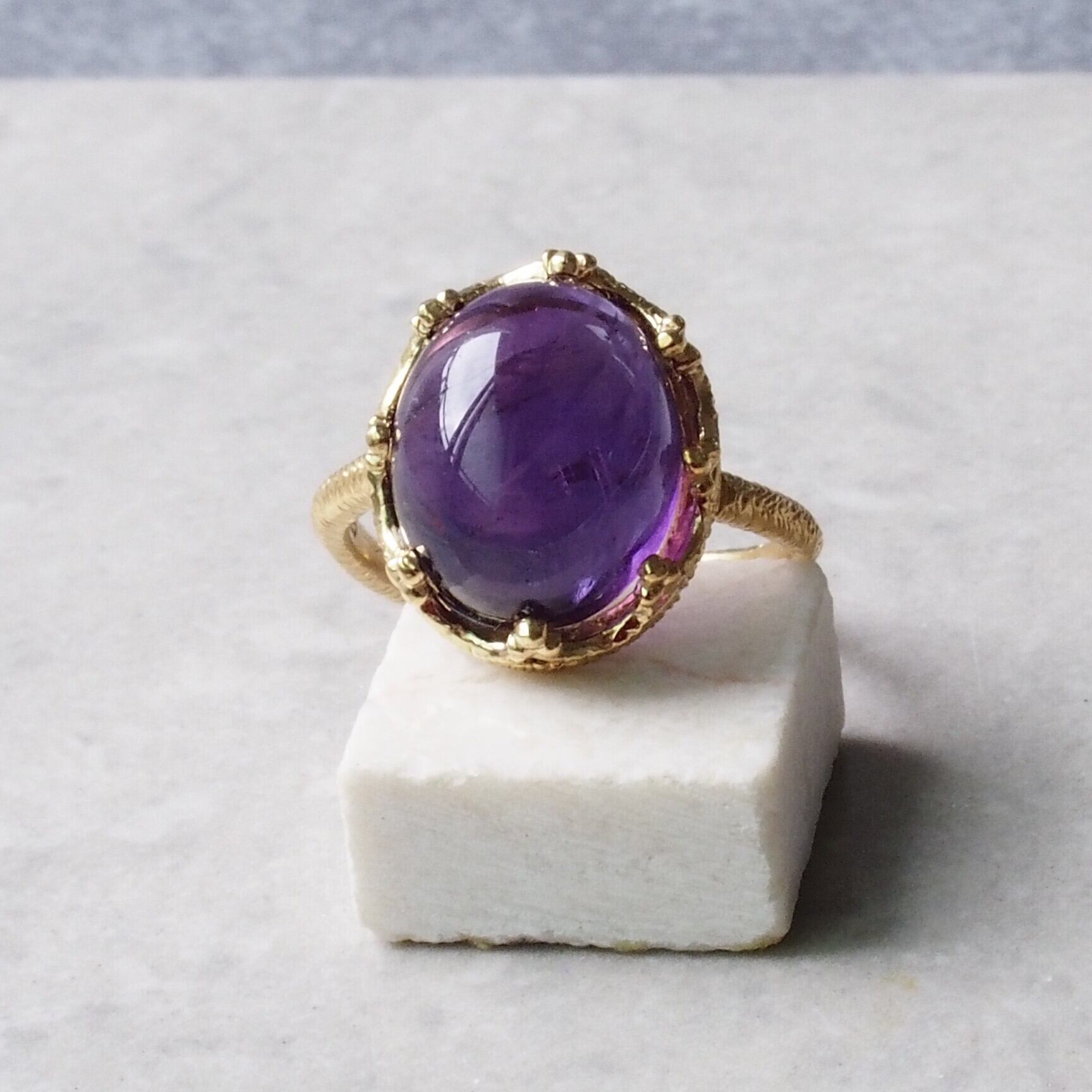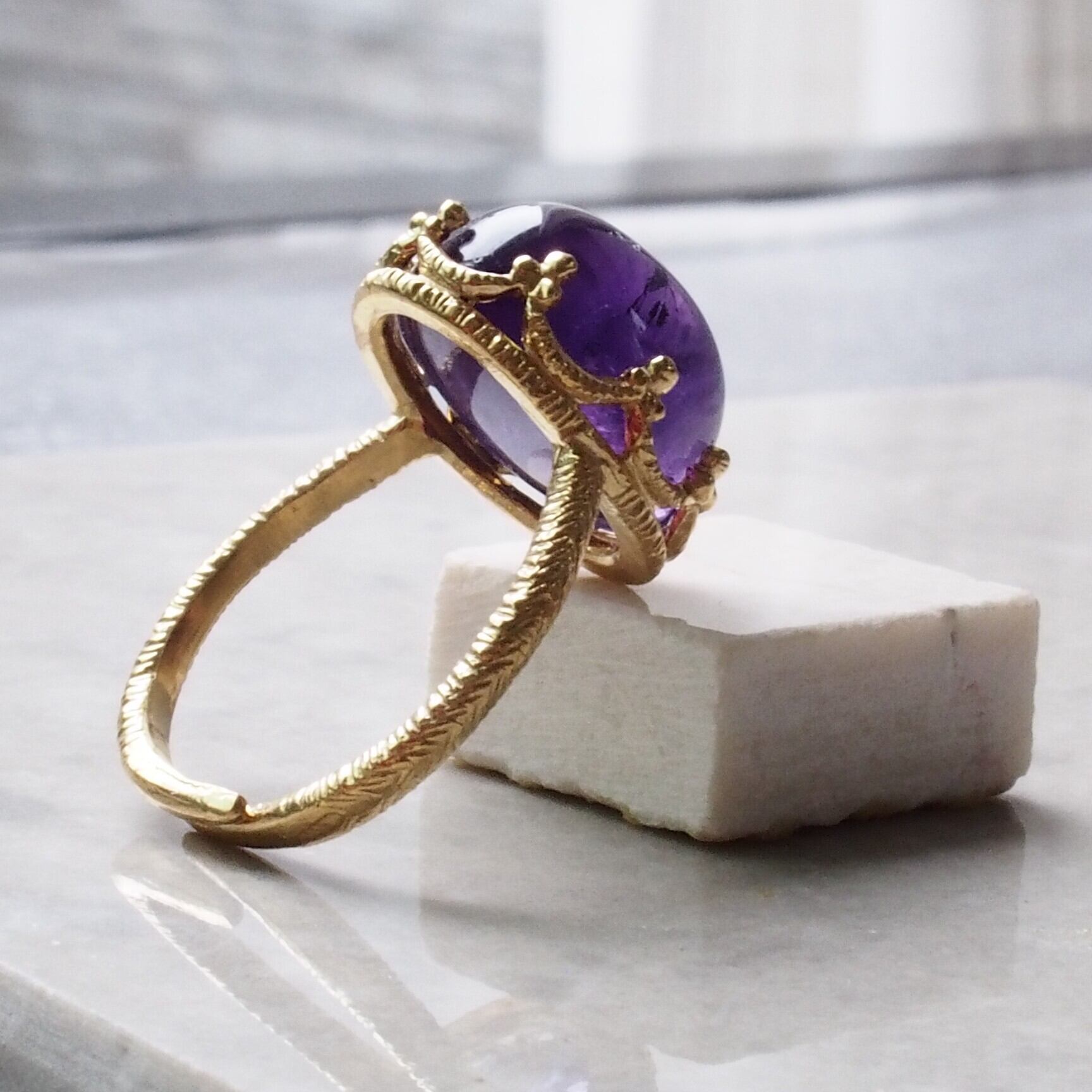 このリングを身に着けることで、アメジストの持つ優れたエネルギーが日常生活に潤いをもたらし、自分らしさを際立たせることができるでしょう。シンプルでありながら存在感を放つデザインは、どんなスタイルにもぴったり。