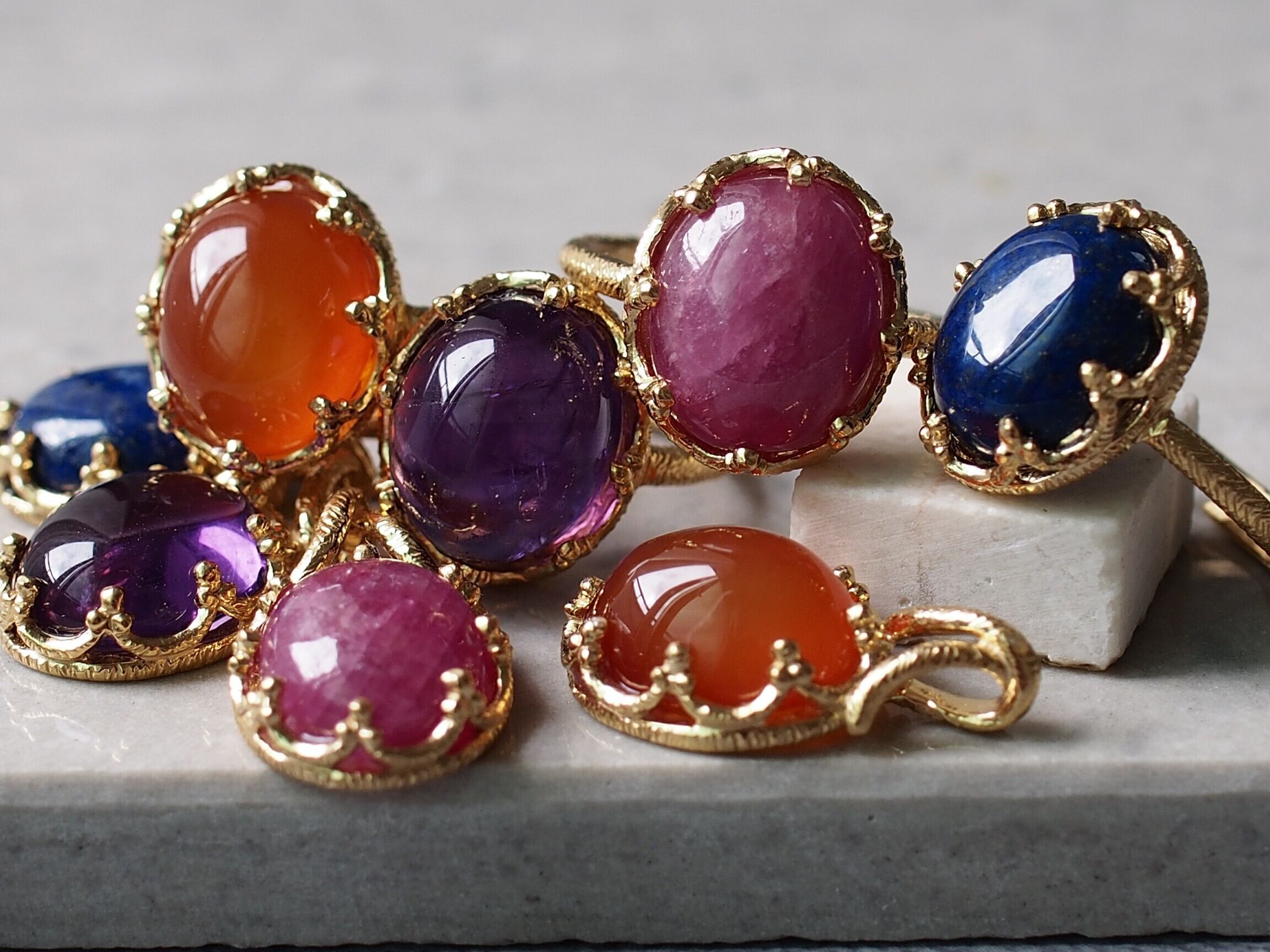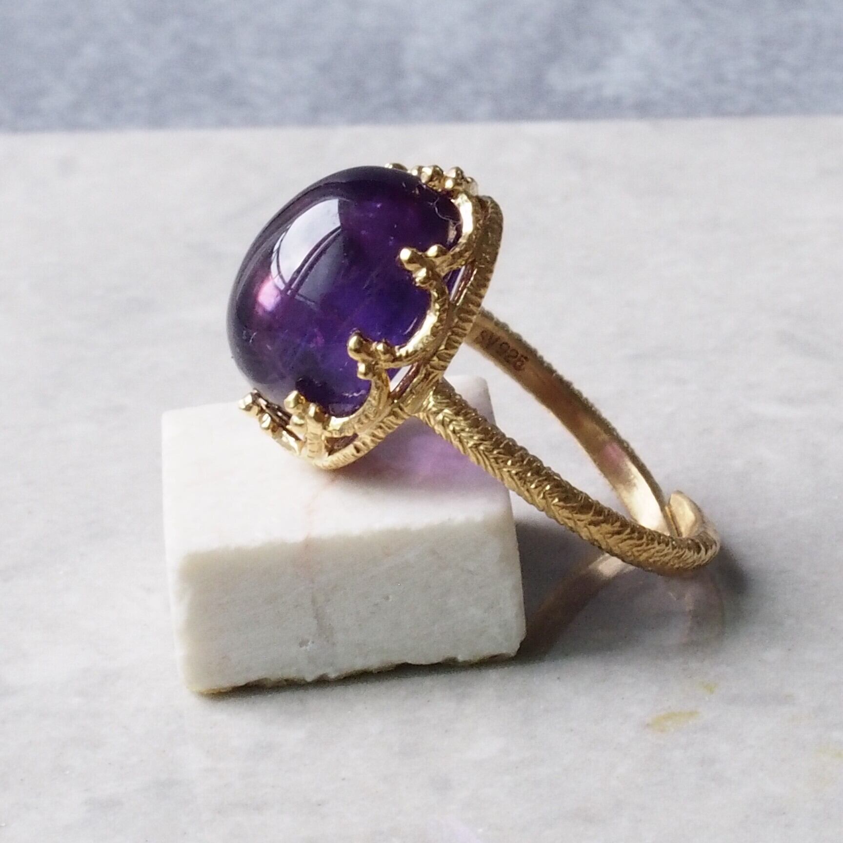 アメジストは、深い紫色が目を引く天然石で、見る人に心の安らぎを与える独自の魅力を持っています。このSV925のスカラップデザインが、アメジストの美しさを一層引き立て、洗練された印象を演出します。丁寧に施されたラスティックなテクスチャーは、普段使いから特別なシーンまで幅広くご利用いただける一品です。