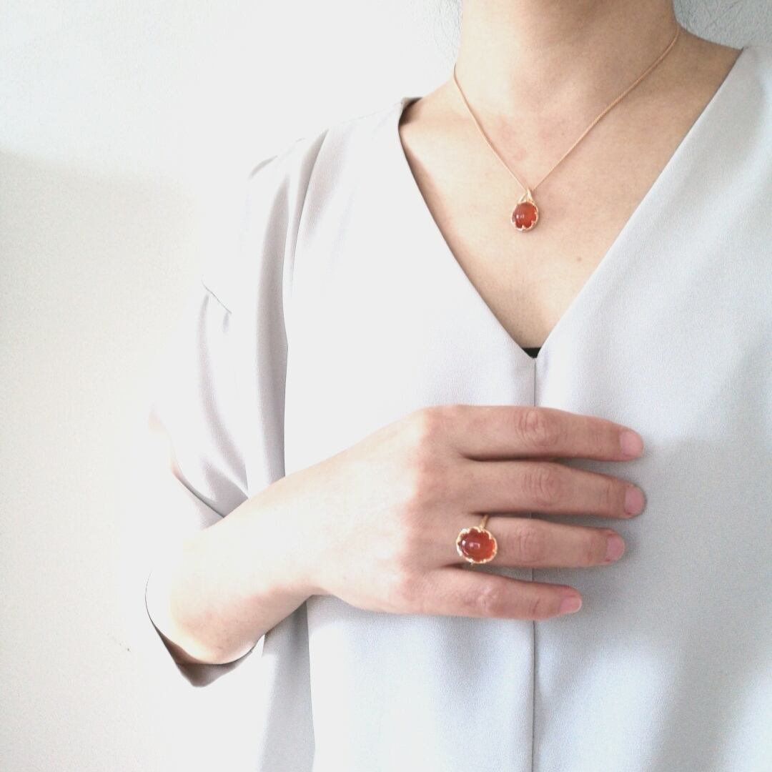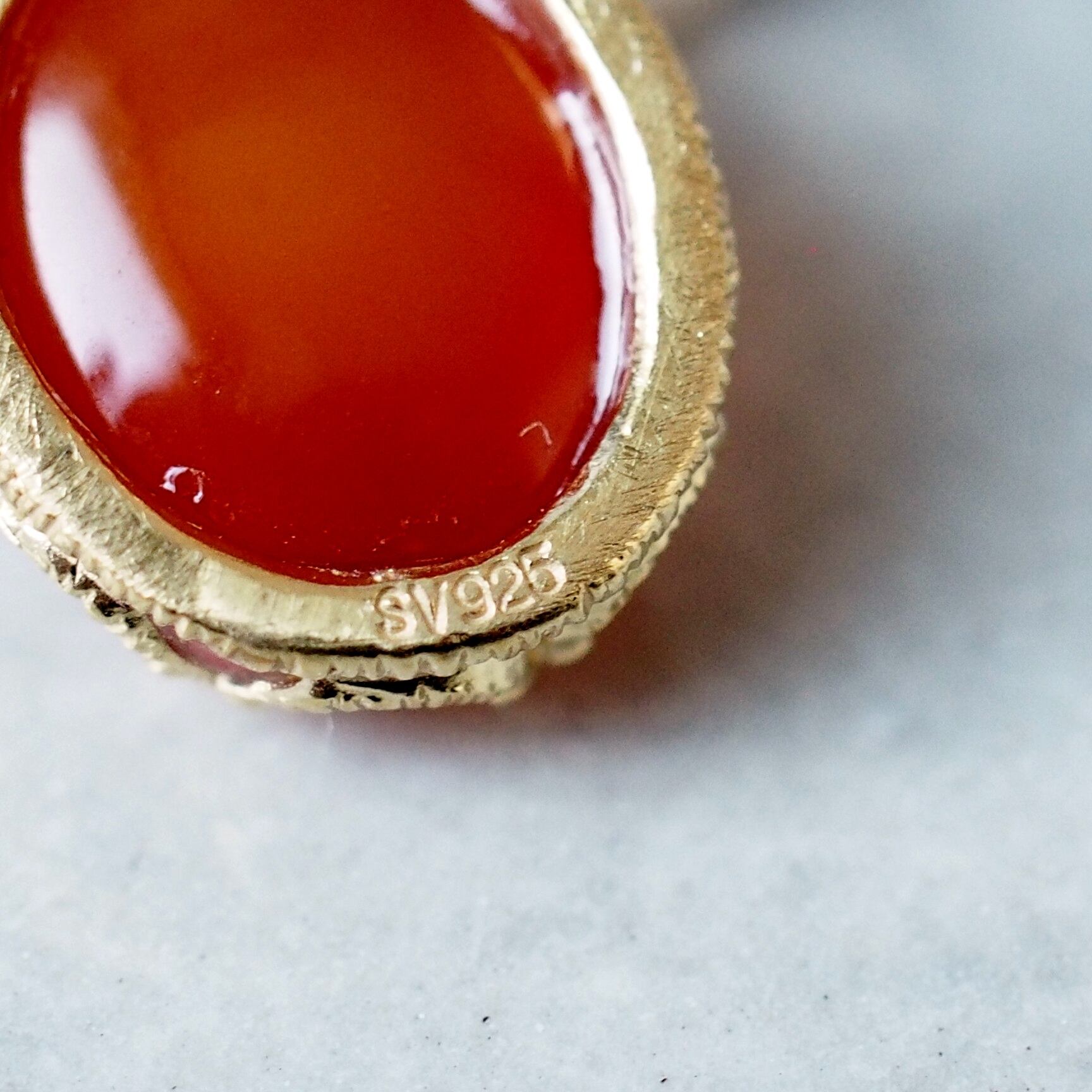 カーネリアンは温かみのあるオレンジ色が特徴的な天然石で、見る人にエネルギーと活力を与える美しいジュエリーです。SV925のスカラップデザインとともに、この石の魅力を引き立て、華やかさを添えています。丁寧に施されたラスティックなテクスチャーは、カジュアルなスタイルからフォーマルなシーンまで幅広くご利用いただけます。