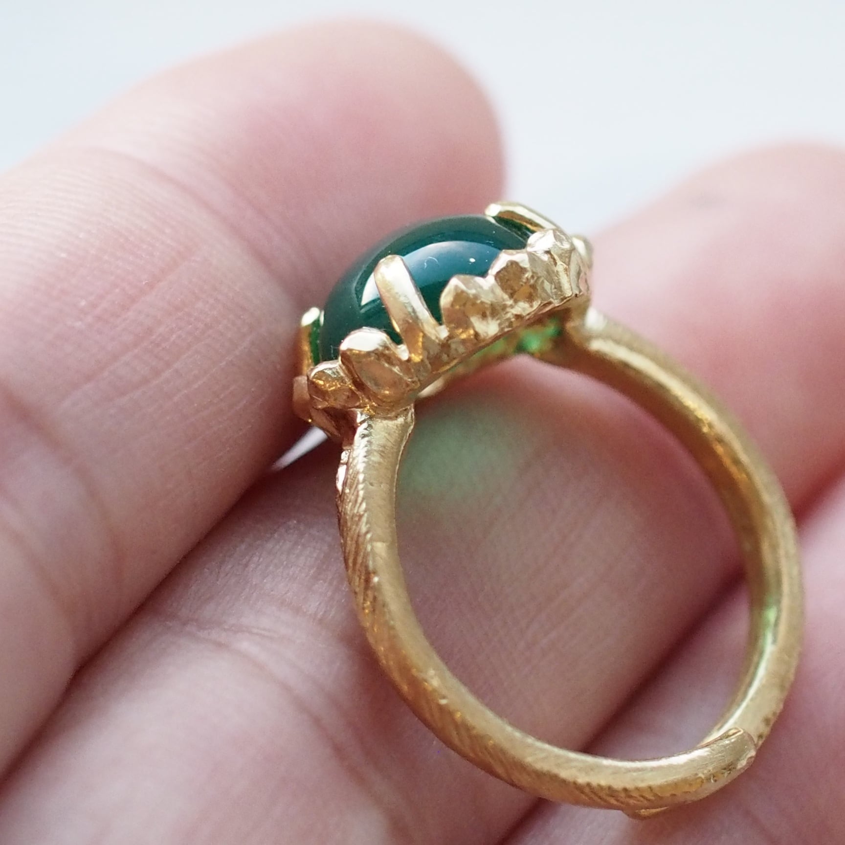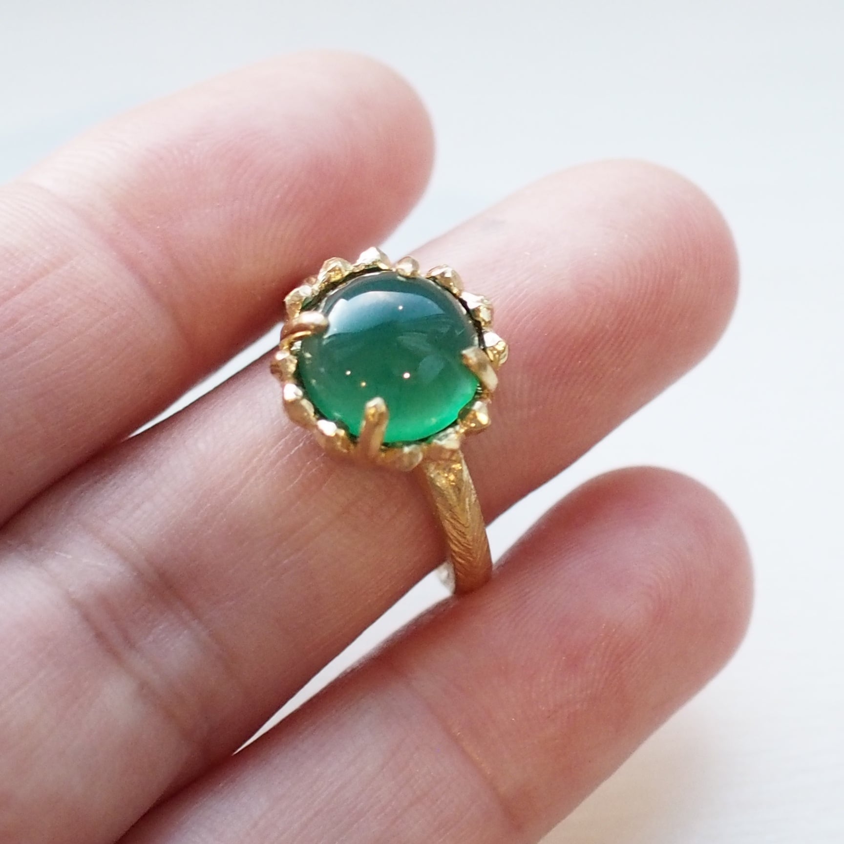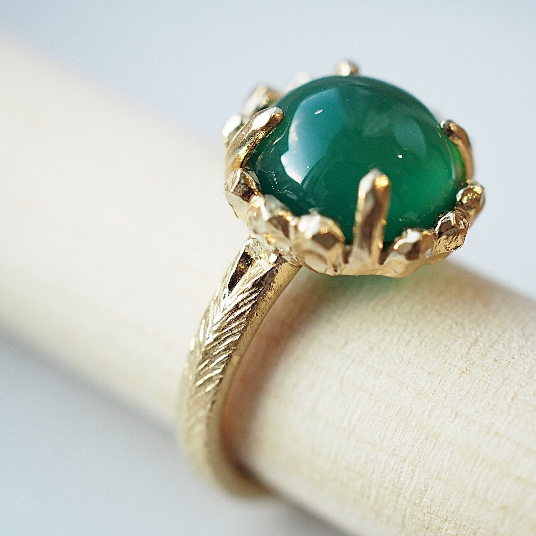 コロンとしたカボッションカットとのコントラストが素敵でグリーンとゴールドトーンとの組み合わせも爽やかで腕のテクスチャーもニュアンスがありよい感じです。