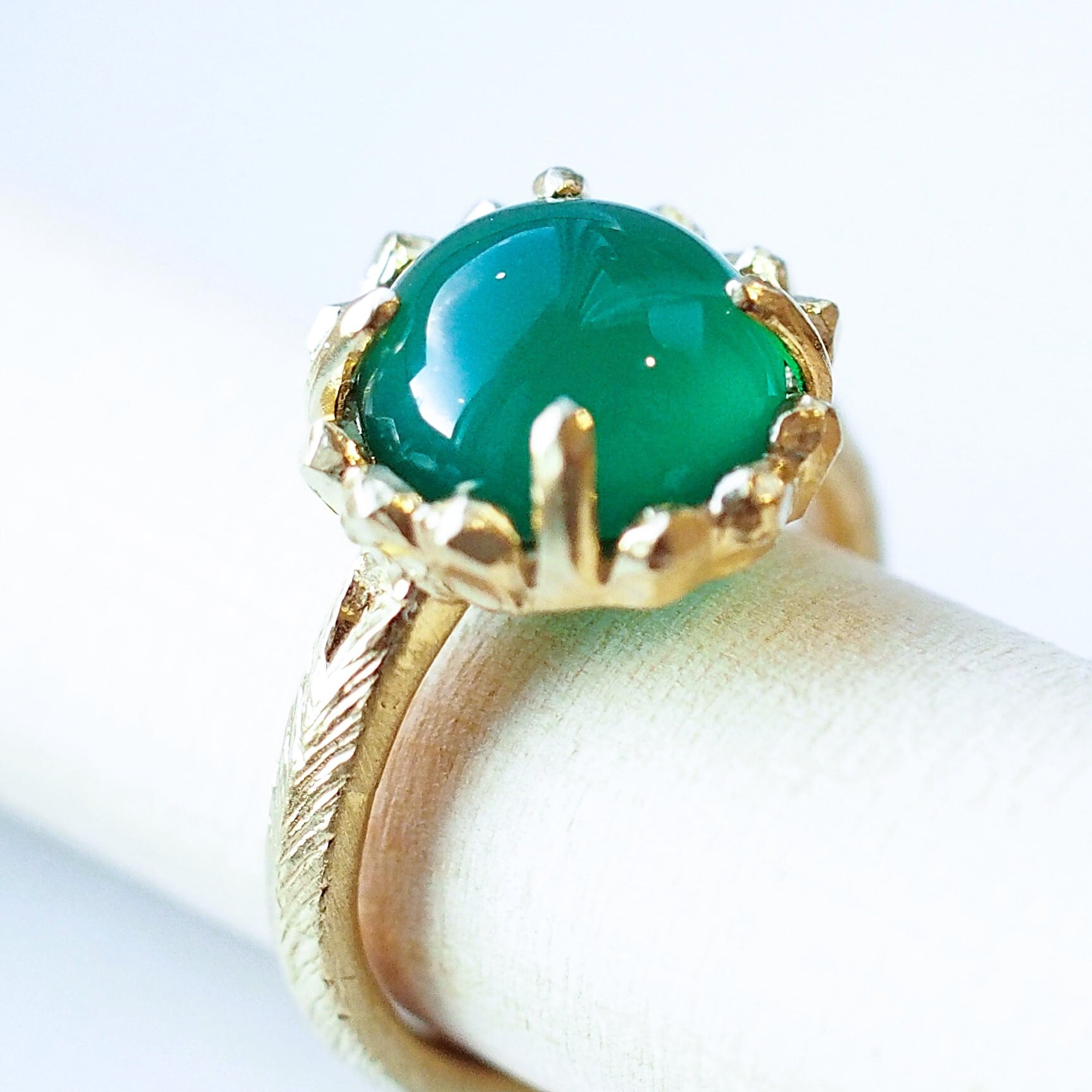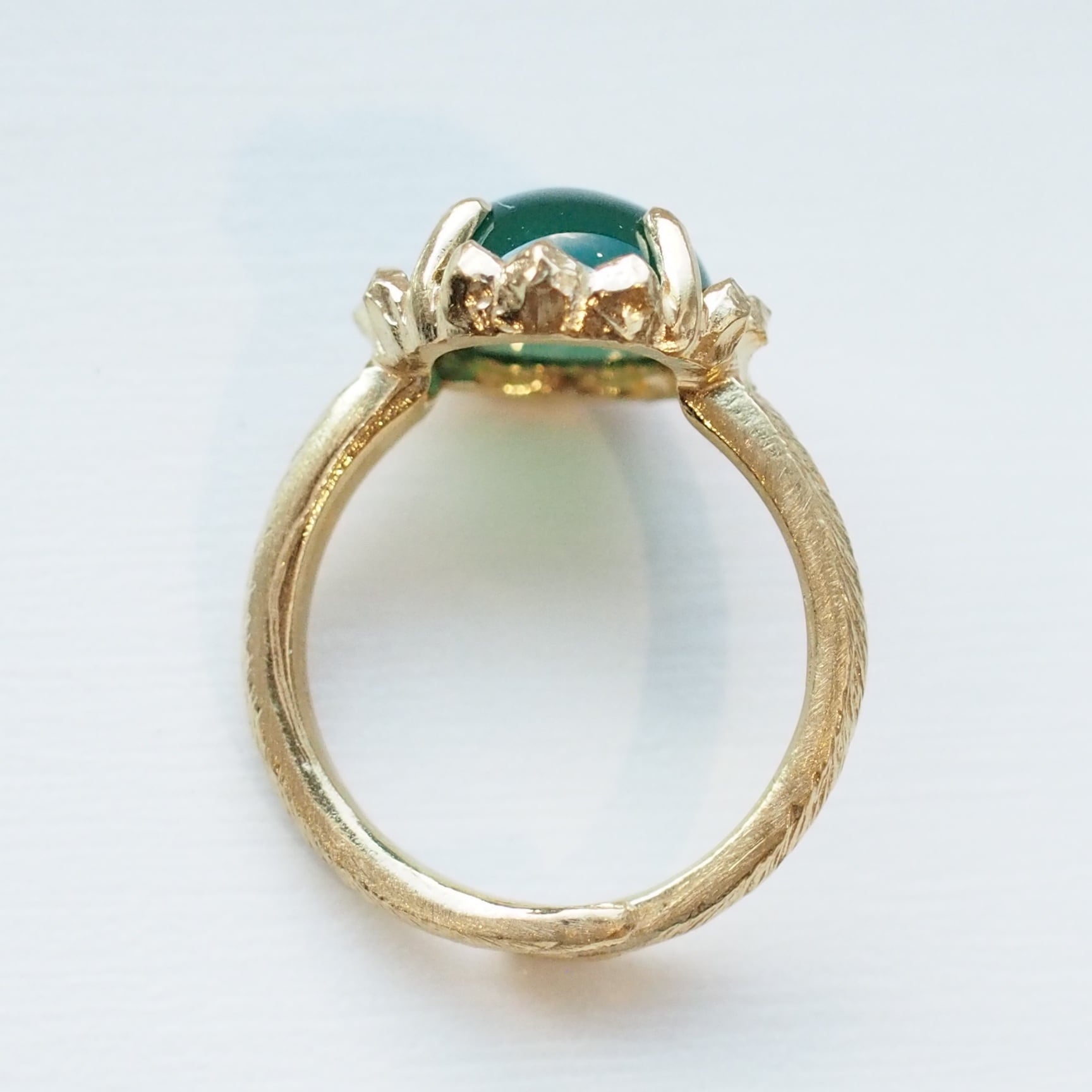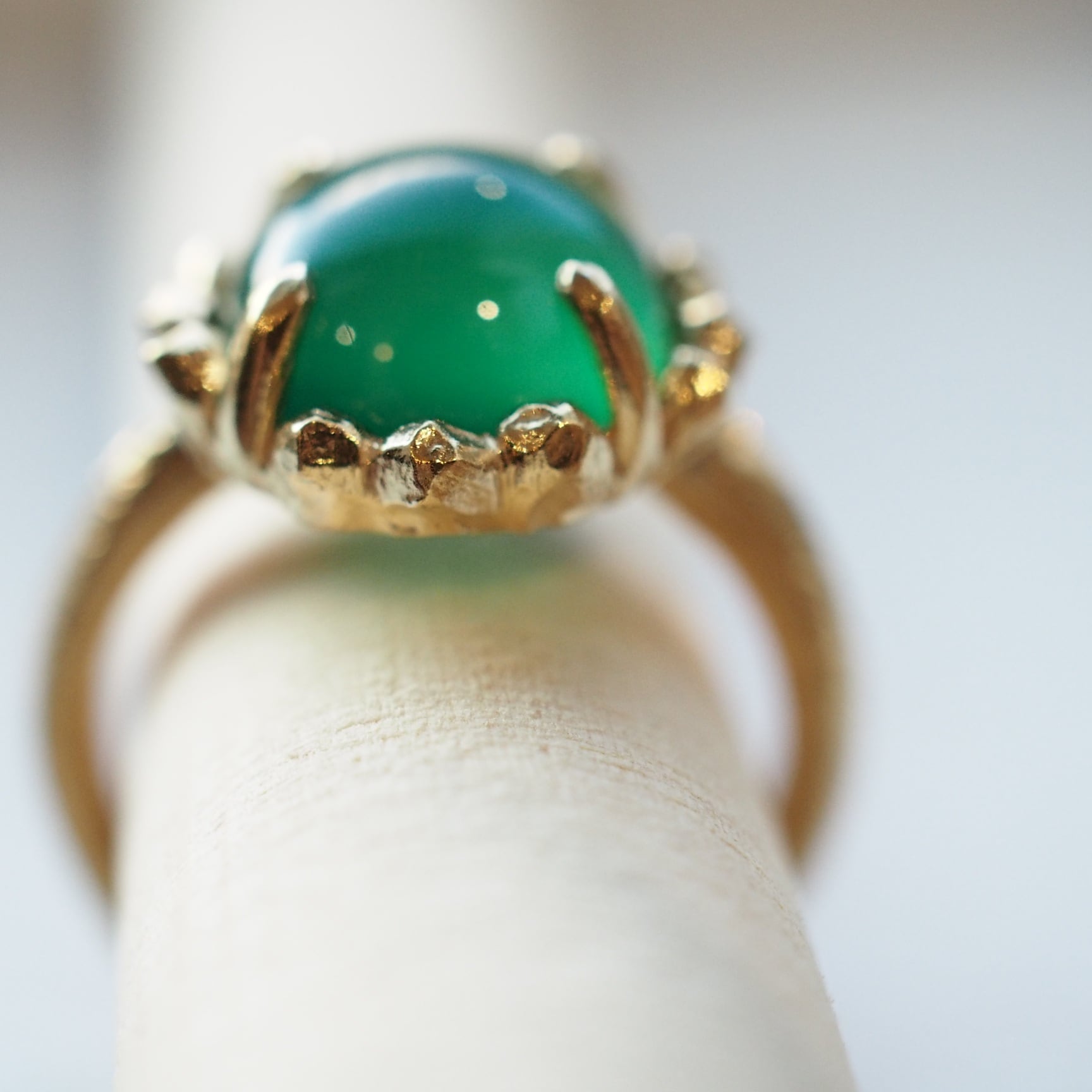 コロンとしたカボッションカットとのコントラストが素敵でグリーンとゴールドトーンとの組み合わせも爽やかで腕のテクスチャーもニュアンスがありよい感じです。