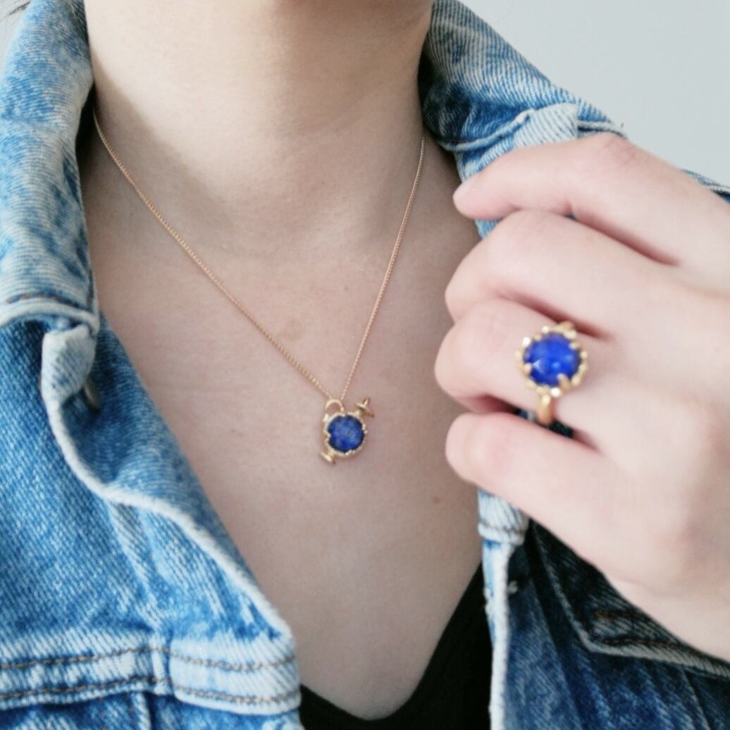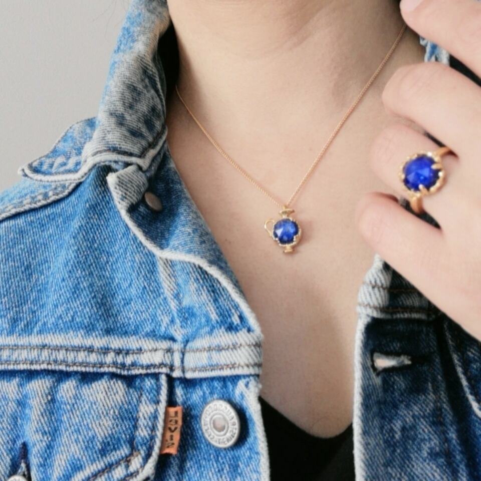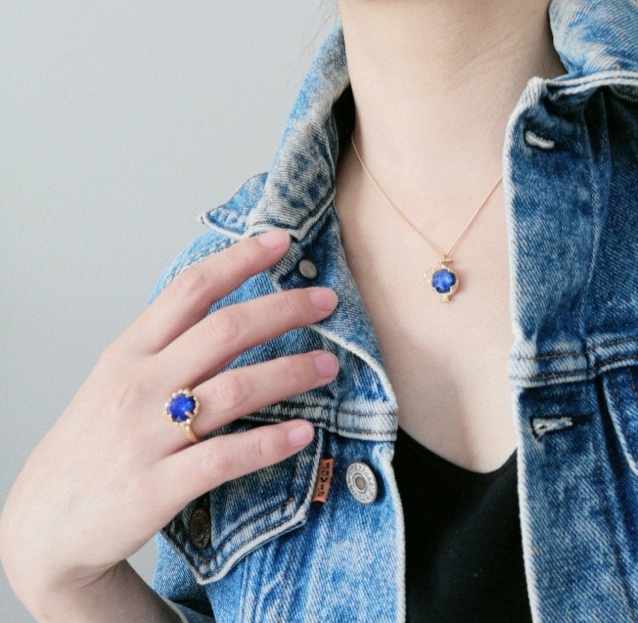 使用しているダブレットストーンとは、複数の異なる素材を貼り合わせて作られた宝石でこちらはラピスラズリと水晶(クリスタル)の組み合わせです。