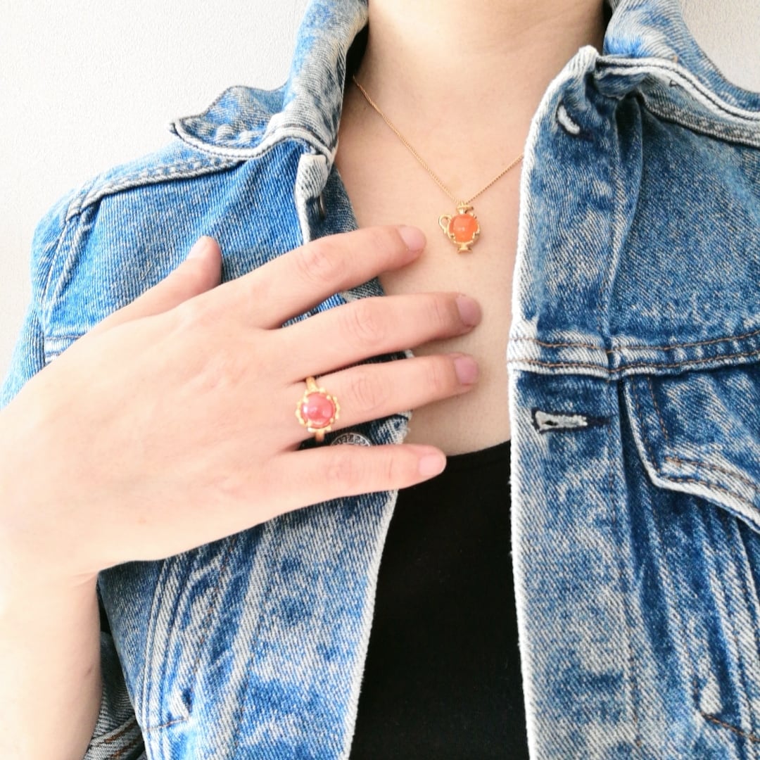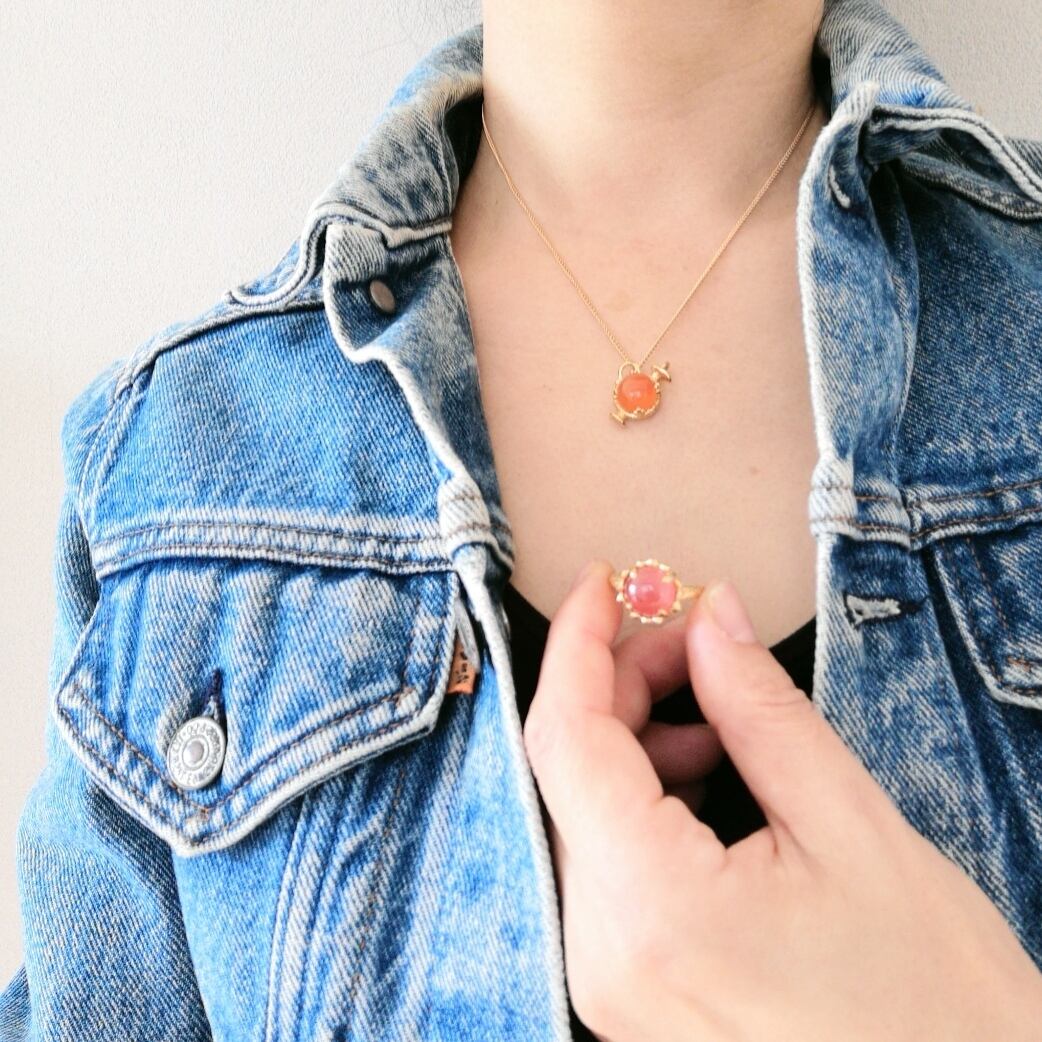 カーネリアンはカルセドニー(玉髄)の一種で、「勇気の石」とも呼ばれ、7月の誕生石です。温かみのあるオレンジ色が特徴的な天然石で、見る人にエネルギーと活力を与える美しいジュエリー。SV925のスカラップデザインとともに、この石の魅力を引き立て、華やかさを添えています。丁寧に施されたラスティックなテクスチャーは、カジュアルなスタイルからフォーマルなシーンまで幅広くご利用いただけます。